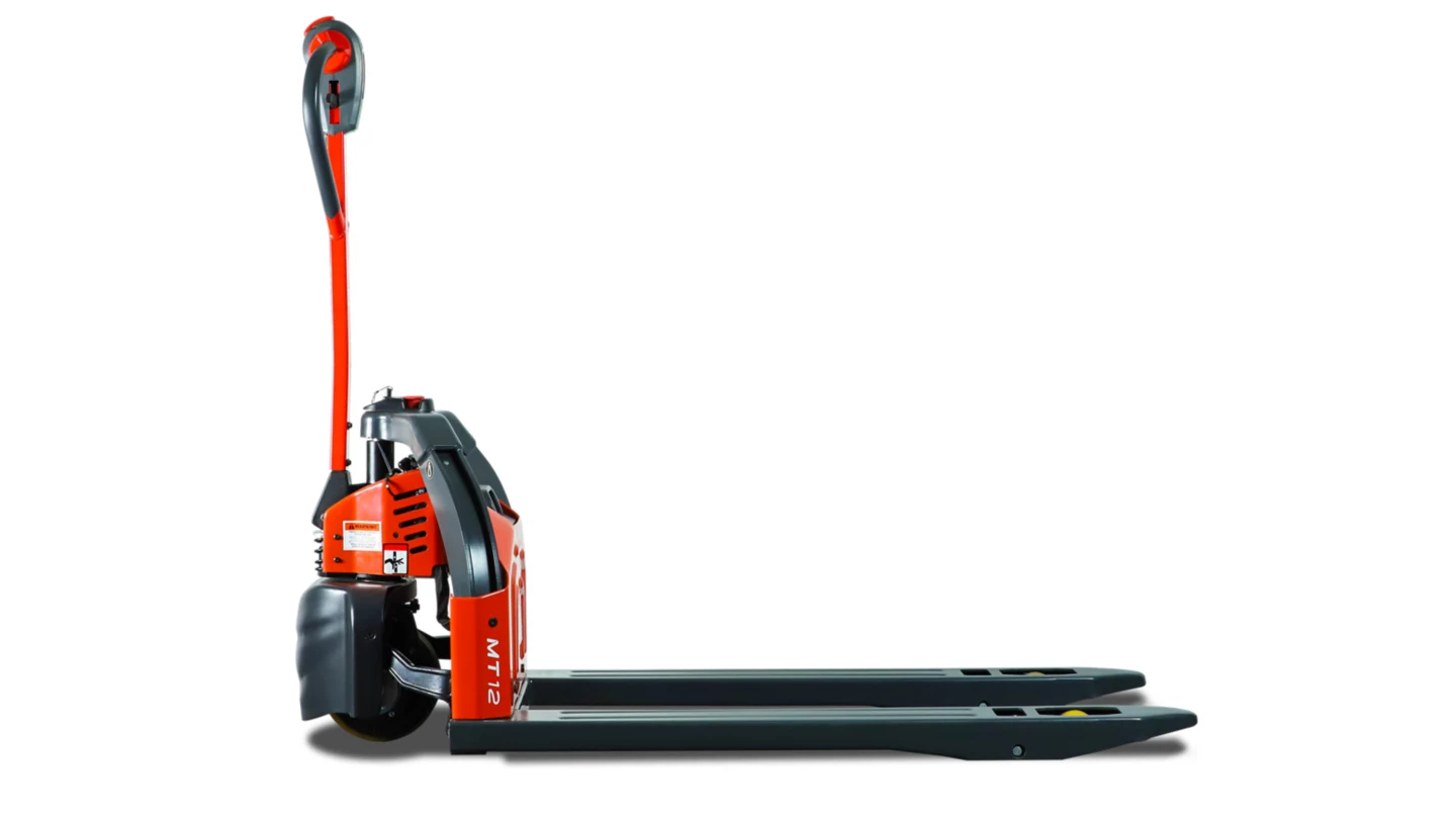 The Linde MT12 electric pallet truck is designed for low-hour applications in small retail stores, warehouses, and production lines, offering a load capacity of 2,600 lbs. Equipped with a 0.65 kW drive motor and powered lift system, the MT12 minimizes the operator’s physical input, making it an efficient and cost-effective solution for short-distance load transfers. Its compact design ensures maximum maneuverability, even in confined spaces, while the robust chassis and reinforced fork structure provide reliable performance.